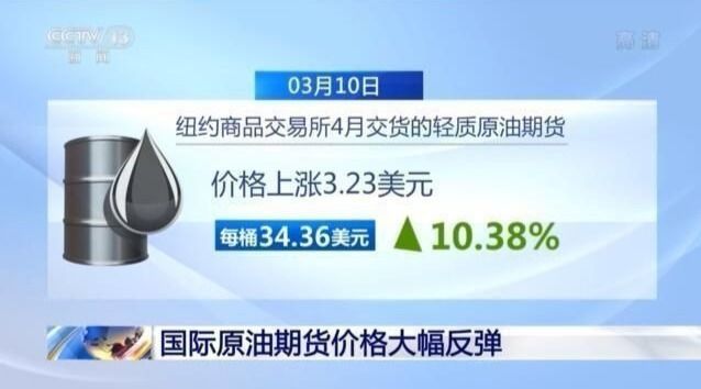 截至当天收盘,纽约商品交易所4月交货的轻质原油期货价格上涨3.23美元,收于每桶34.36美元,涨幅为10.38%。5月交货的伦敦布伦特原油期货价格上涨2.86美元,收于每桶37.22美元,涨幅为8.32%。