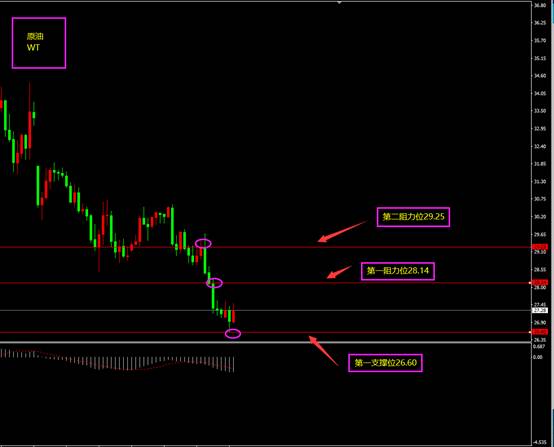 技术点评:天图原油因基本面因素出现大幅度暴跌,昨日再次创新低,因沙特增产至1000万桶/日,正是最极端的情况下,原油短时间将出现大量投机买盘,近期或将出现大幅度反弹?小时图原油期间连续阴线回落,MACD虽位于0轴之下,但空头力度不强势,底部有大阳线产生,日内在不创新低情况下有望反弹,或将重回30美元?